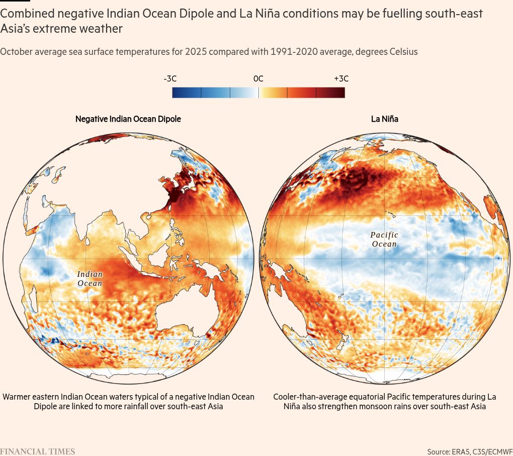 Meteorologists say the region’s most recent extreme weather appears to be driven by the interactions between Cyclone Senyar over the Malacca Strait and Typhoon Koto over the South China Sea. Cyclone Ditwah also formed over the Bay of Bengal towards the end of the week.