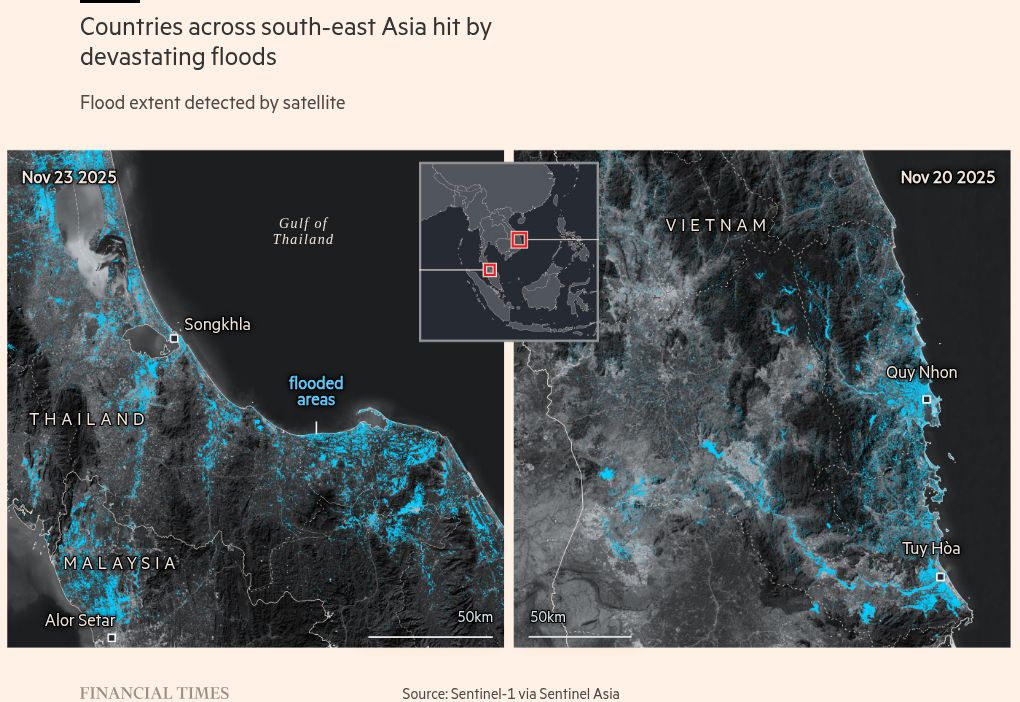 Unlock the Editor’s Digest for free Roula Khalaf, Editor of the FT, selects her favourite stories in this weekly newsletter. Flooding across much of south-east Asia fuelled by a rare cluster of three tropical storms has claimed the lives of more than 900 people in five countries, with Indonesia the worst hit so far. Meteorologists say the region’s most recent extreme weather appears to be driven by the interactions between Cyclone Senyar over the Malacca Strait and Typhoon Koto over the South China Sea. Cyclone Ditwah also formed over the…