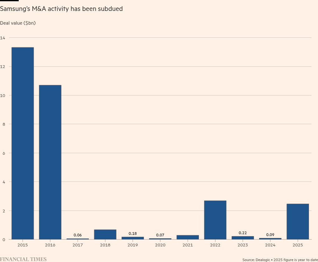 But since the purchase of the US company, Samsung has not closed any deals of that magnitude. Over the past year, the tech group has completed six acquisitions, including a deal to buy German data-centre cooling company FläktGroup for €1.5bn.