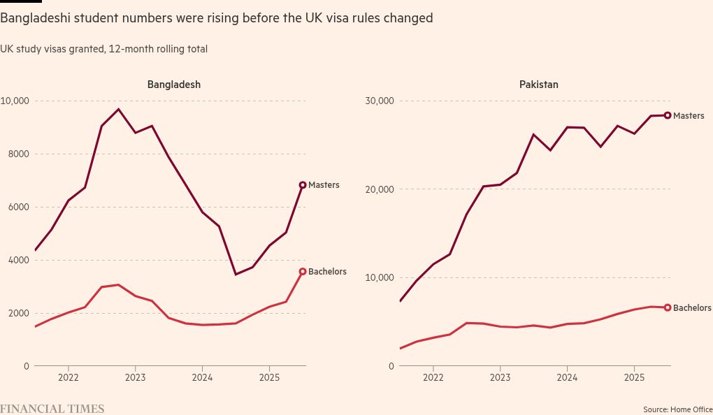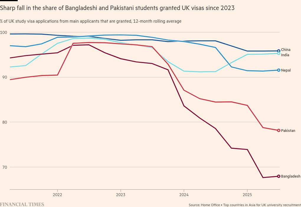 The average refusal rate for Pakistan and Bangladesh student visa applications, excluding dependants, in the year to September 2025 was 18 and 22 per cent respectively — well above the new limit.