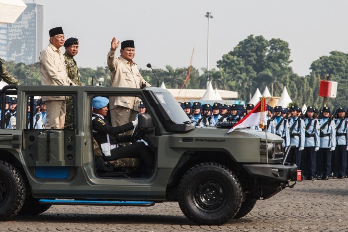 President Prabowo, right, and defence minister Sjafrie Sjamsoeddin lead a parade held as part of celebrations marking the 80th anniversary of the Indonesian armed forces at Merdeka Square in Jakarta in October © Adita Irawan/AFP/Getty Images