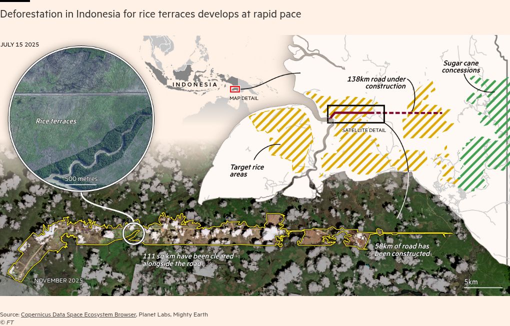 Billed as a project to ensure the fourth most populous nation’s food and energy security, Indonesia is planning to cultivate rice and sugar on 3mn hectares in the eastern province of Papua. The area covers a mix of primary forests, grasslands, woodlands and wetlands.