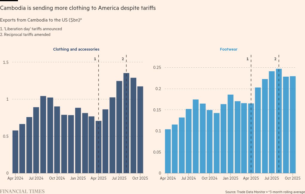 Ken Loo, secretary-general of Cambodia’s Textile, Apparel, Footwear & Travel Goods Association, said Trump’s tariffs had initially “stressed” the industry, but its worries dissipated as it emerged that competitors in Bangladesh, Vietnam and Indonesia were facing similar duties.