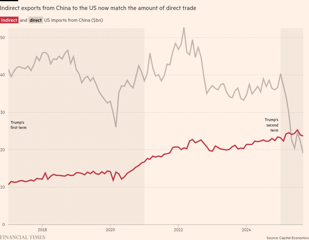 The amount of trade rerouting from China — which is subject to a reciprocal tariff of 37 per cent — has been rising since Trump’s first presidency, reaching an all-time high of $23.7bn in September, according to analysis by the consultancy Capital Economics.
