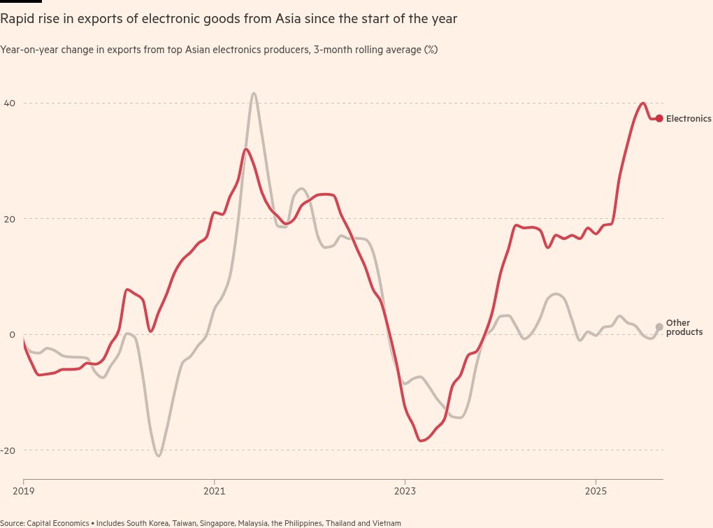 “Exports of electronic goods are now growing at around 40 per cent year-on-year — faster than at the peak of the pandemic — when lockdowns led consumers to gorge on electronic products made in Asia,” Capital Economics said in a recent note to clients. It predicted that the strong demand was “likely to be sustained” in 2026.
