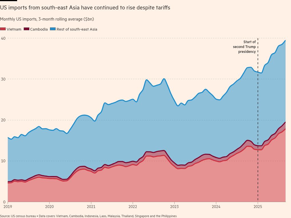 Goods exports from south-east Asia to the US rose 25 per cent between July and September relative to the same period in 2024 despite the US president’s trade war, according to data from the US Census Bureau.