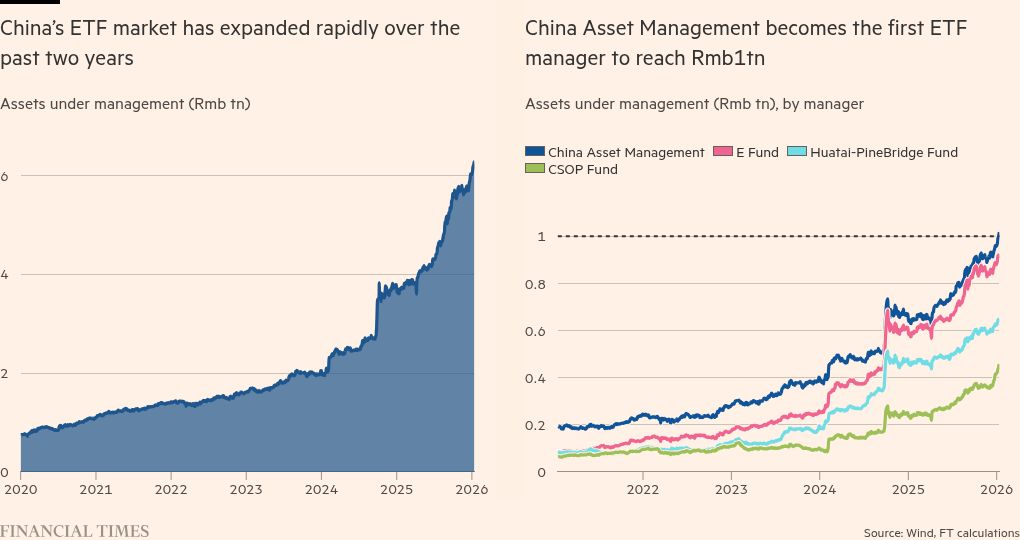 Stay informed with free updates Simply sign up to the Chinese business & finance myFT Digest — delivered directly to your inbox. One of China’s largest asset managers has become the first company in the country to pass Rmb1tn ($143bn) in exchange traded funds under management, a beneficiary of Beijing’s push to get the “national team” to support stocks. The value of China Asset Management’s ETFs reached Rmb1.02tn earlier this week, according to data company Wind. E Fund, another leading Chinese asset manager, is also approaching that amount. While China’s…