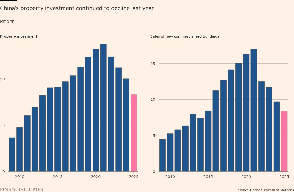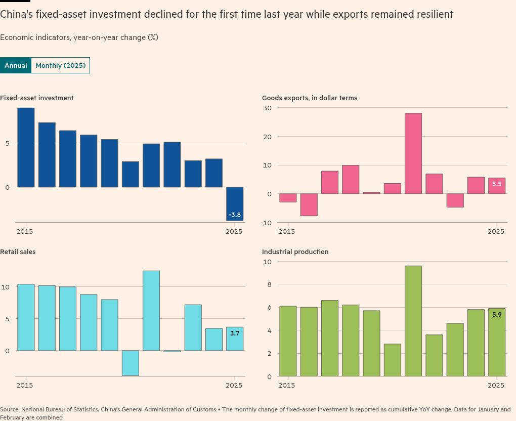 China’s fixed asset investment fell 3.8 per cent year on year in 2025, worse than analysts’ expectations of a 3.1 per cent fall and contrasting with growth of 3.2 per cent a year earlier.