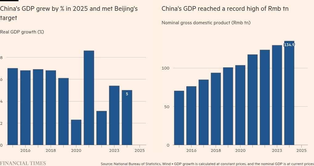 China’s GDP grew 5 per cent last year despite US President Donald Trump’s tariff war, as booming exports offset more anaemic growth in the domestic economy, according to official data.