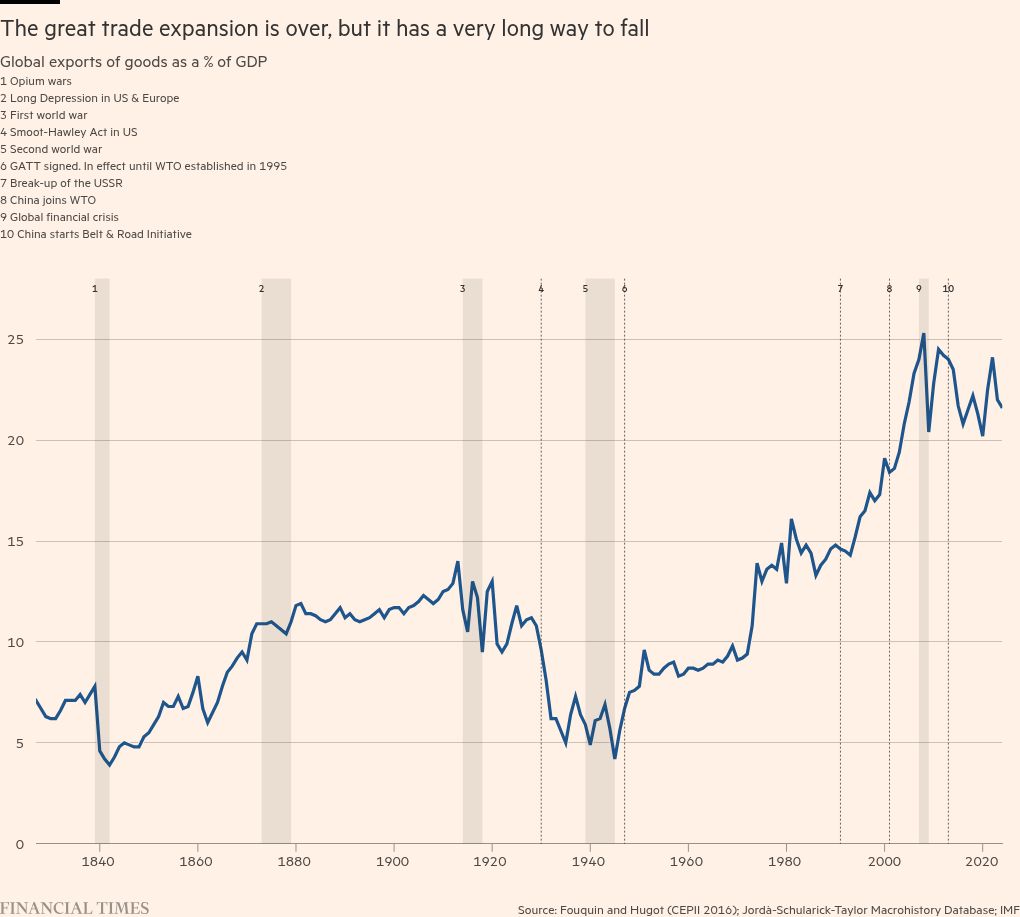 Over much the same period, Donald Trump, obsessed with US trade deficits — both overall and, even more, in manufactured goods — raised average tariff rates to an estimated 14.4 per cent, the highest level since shortly after the second world war.