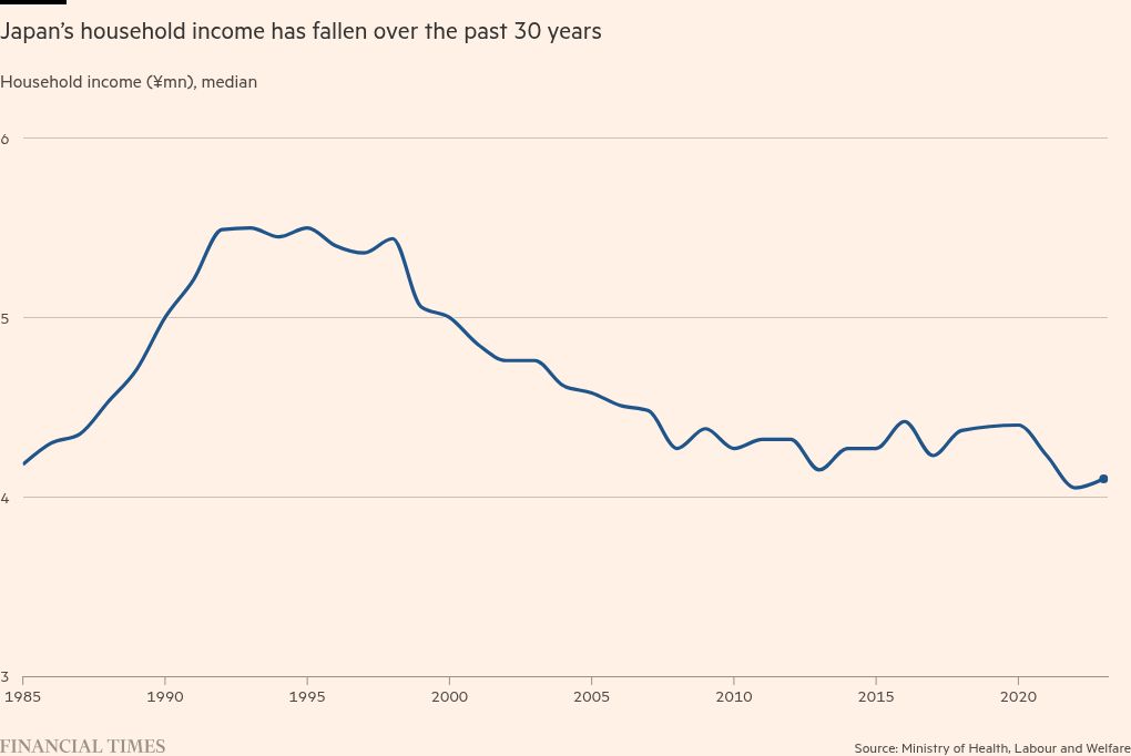 More voters than ever before are in the setsuyaku ikka category. Median household income has slid from ¥5.5mn ($36,000) in 1993 to ¥4.1mn in 2023, according to labour ministry statistics.