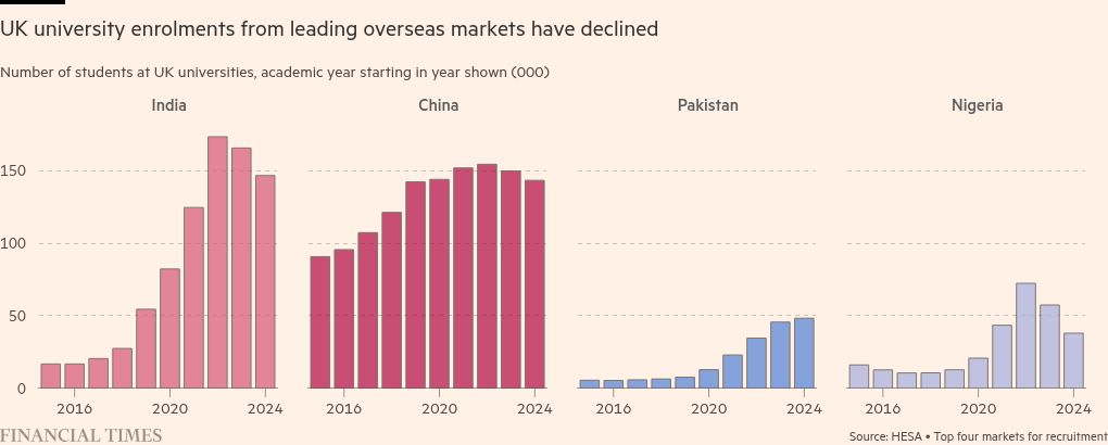 The risks of over-reliance on a single country were underscored by a collapse in recruitment from Nigeria, the UK’s third-largest market, where the number of new students halved between 2022-23 and 2024-25 after it experienced a currency crisis.