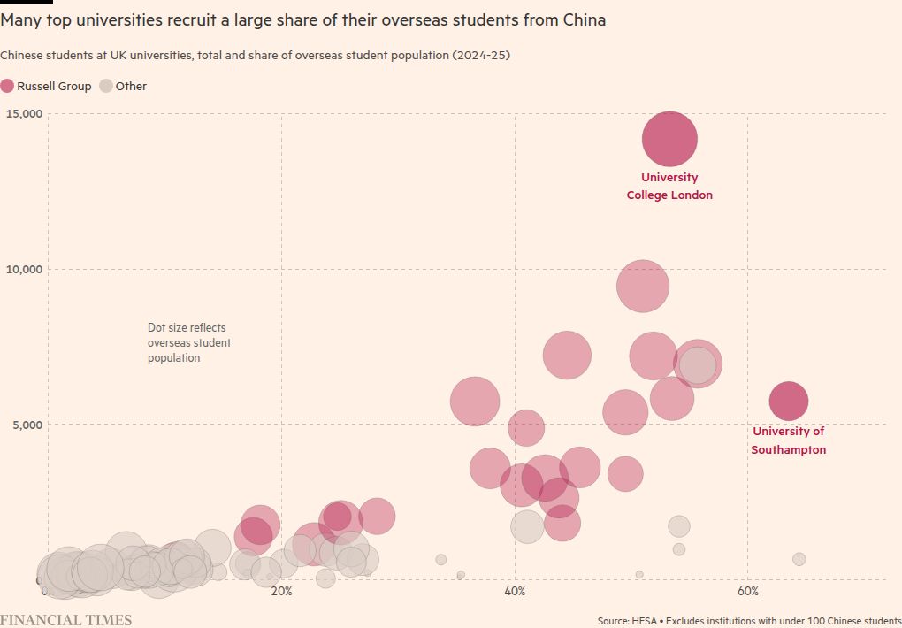 There were almost 105,000 Chinese students at Russell Group universities in 2024-25, representing 42.5 per cent of their international student population, according to FT analysis of official data published on Tuesday.