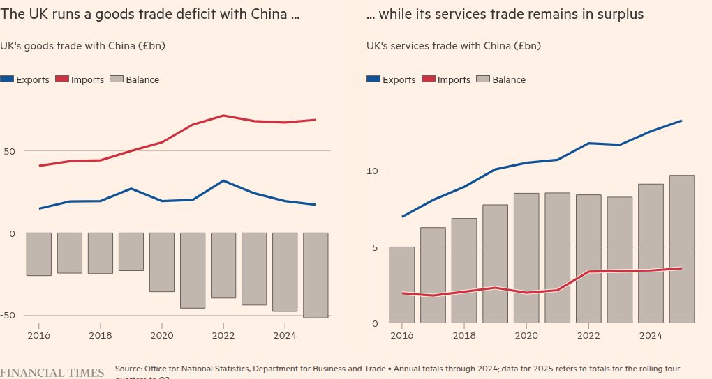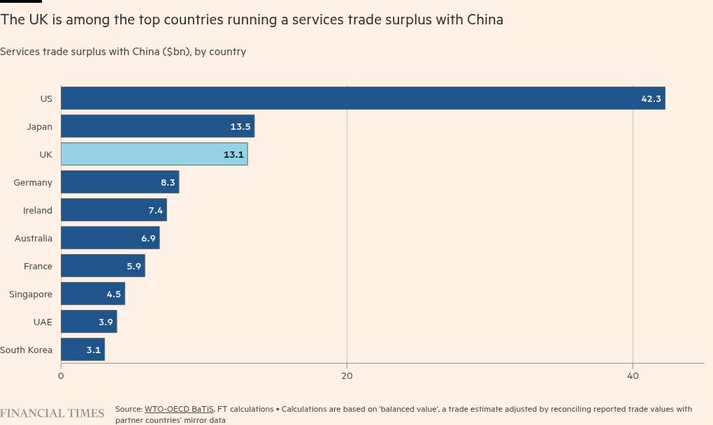 In contrast to its £52bn trade deficit in goods with China in the year to the end of last June, the UK had a £10bn surplus in services, and it hopes the City’s financial and professional services firms can play a greater role in China in coming years.