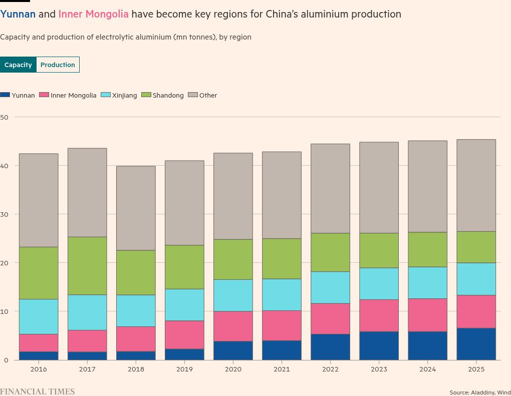 However, following a spree of relocations in recent years, 13mn tonnes of that capacity — about 30 per cent — now comes from new smelters in areas with clean energy and low-development costs in Yunnan, Sichuan, Xinjiang and Inner Mongolia.
