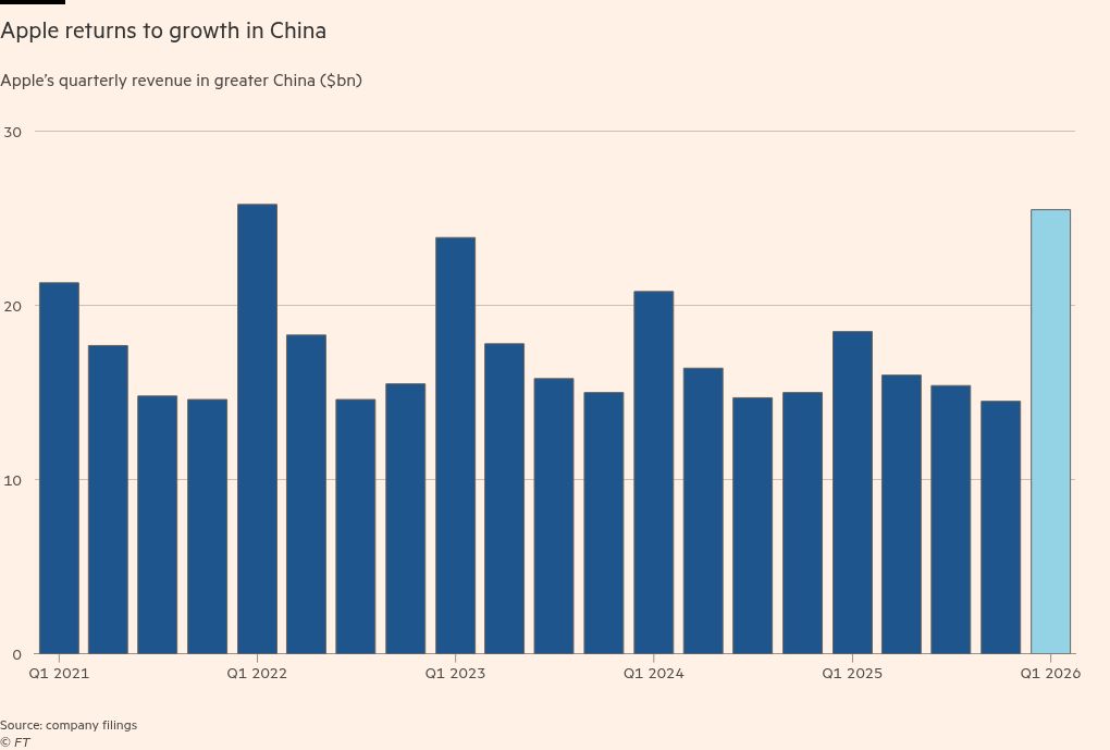Chief executive Tim Cook recently touted Apple’s record-breaking iPhone sales in China in the fourth quarter, when revenue jumped 38 per cent year-on-year to $26bn, contributing nearly a fifth of total sales.