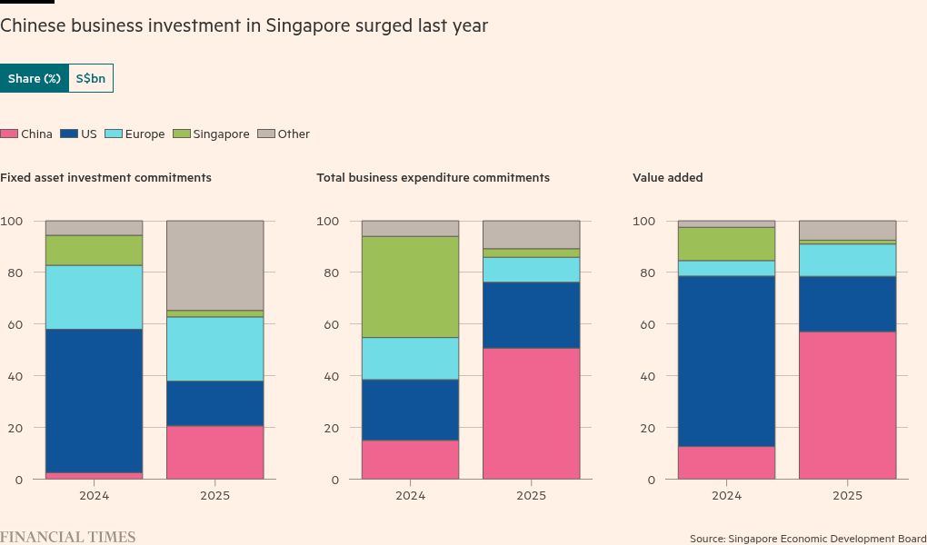 China accounted for just over half of Singapore’s total business expenditure in 2025, up from 15 per cent a year earlier, according to figures released by Singapore’s Economic Development Board on Monday.