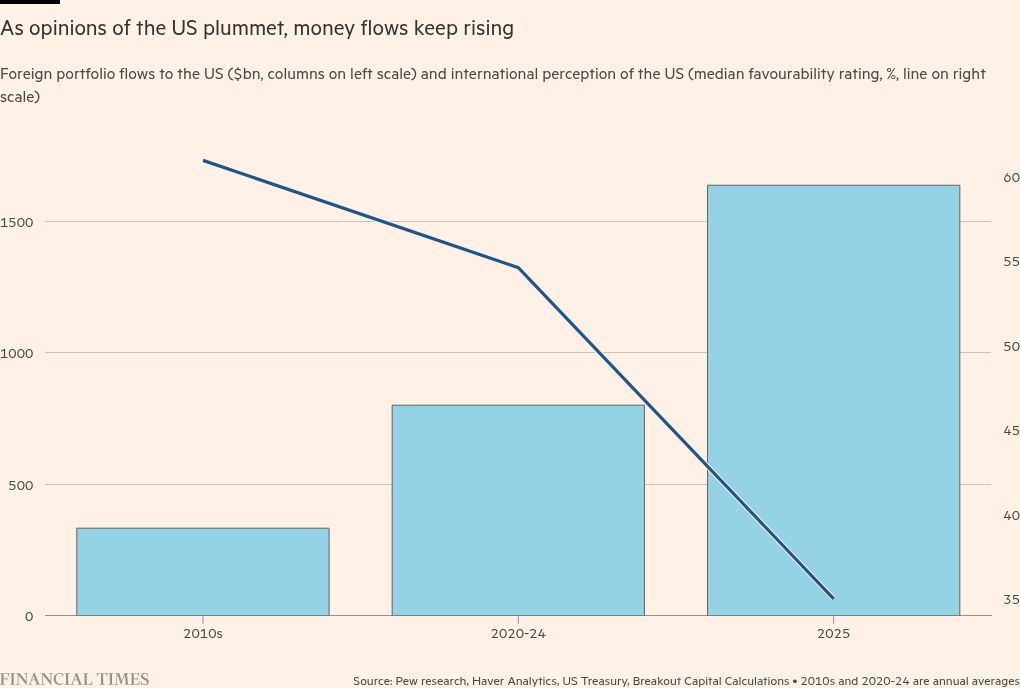 People love to bash the US, but they continue to pour money into it, writes Ruchir Sharma. But for a brief “Sell America” wave last April, foreigners were big buyers in every month of 2025.