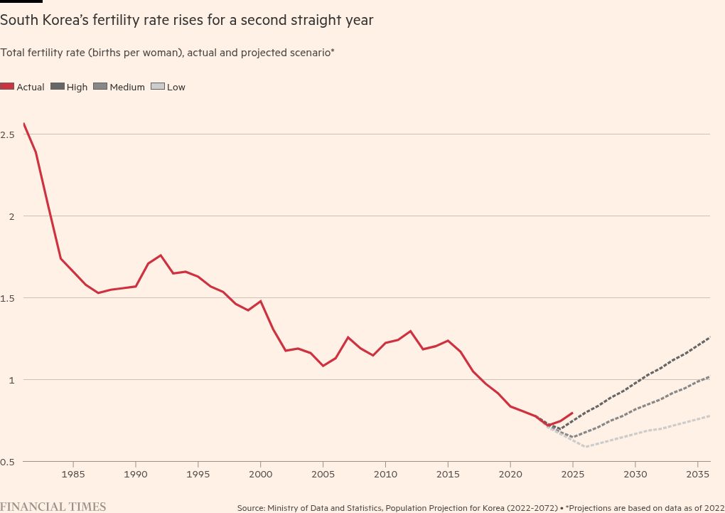South Korea’s fertility rate has climbed for a second consecutive year, bucking a long-term trend of population decline that has plunged the country into one of the world’s worst demographic crises.