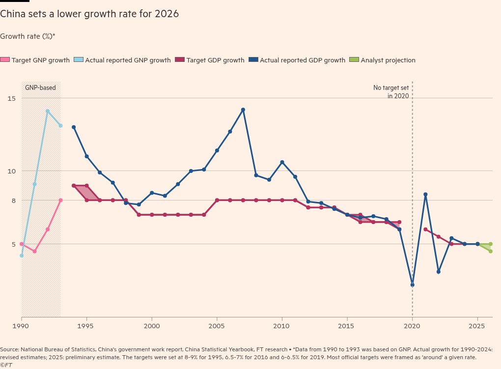 The GDP target, contained in the government’s “work report”, which lays out its goals for the year, represents a modest step down from last year’s goal of “around 5 per cent” and the actual growth of 5 per cent during 2025.