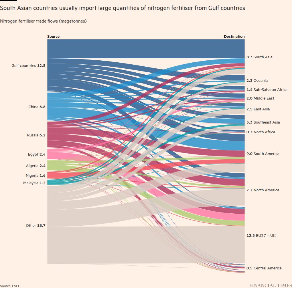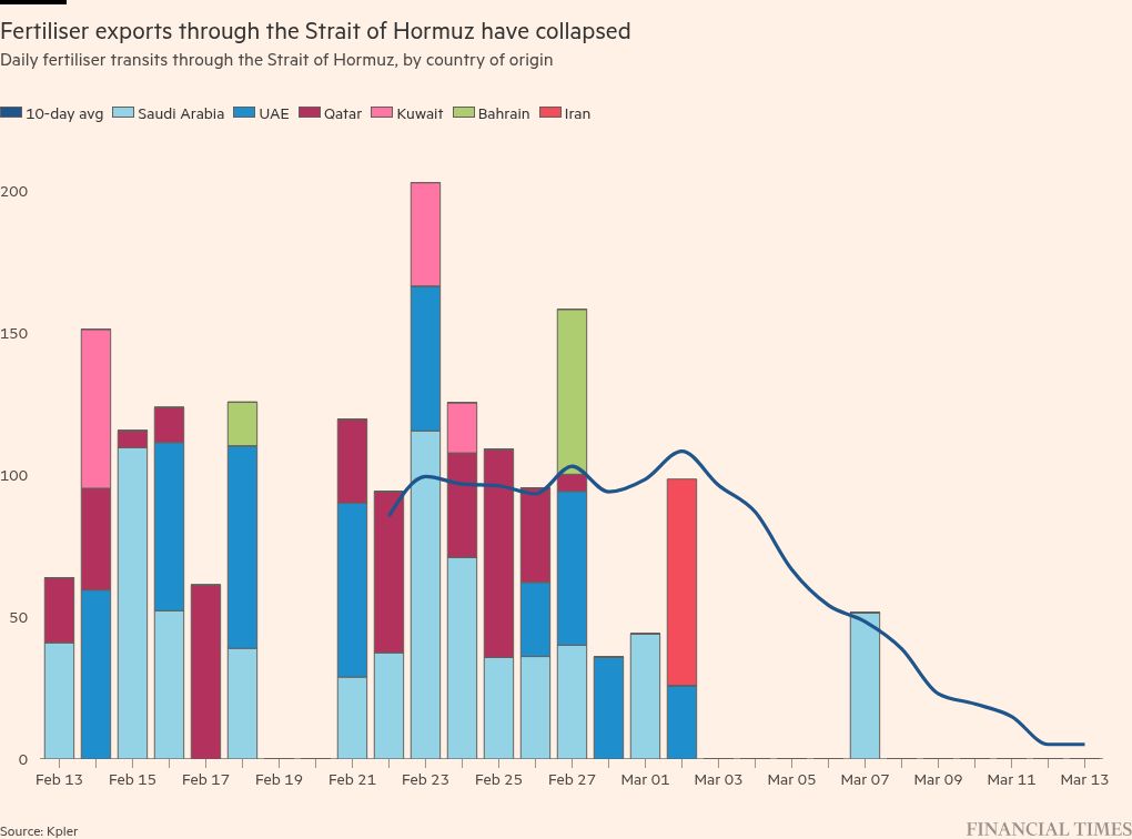 The Middle East sits at the centre of global fertiliser and energy supply chains. About a third of global urea exports pass through the Strait of Hormuz, according to CRU. About 45 per cent of global sulphur exports — a key input for phosphate fertilisers — are also shipped through the vital waterway, which has in effect closed.