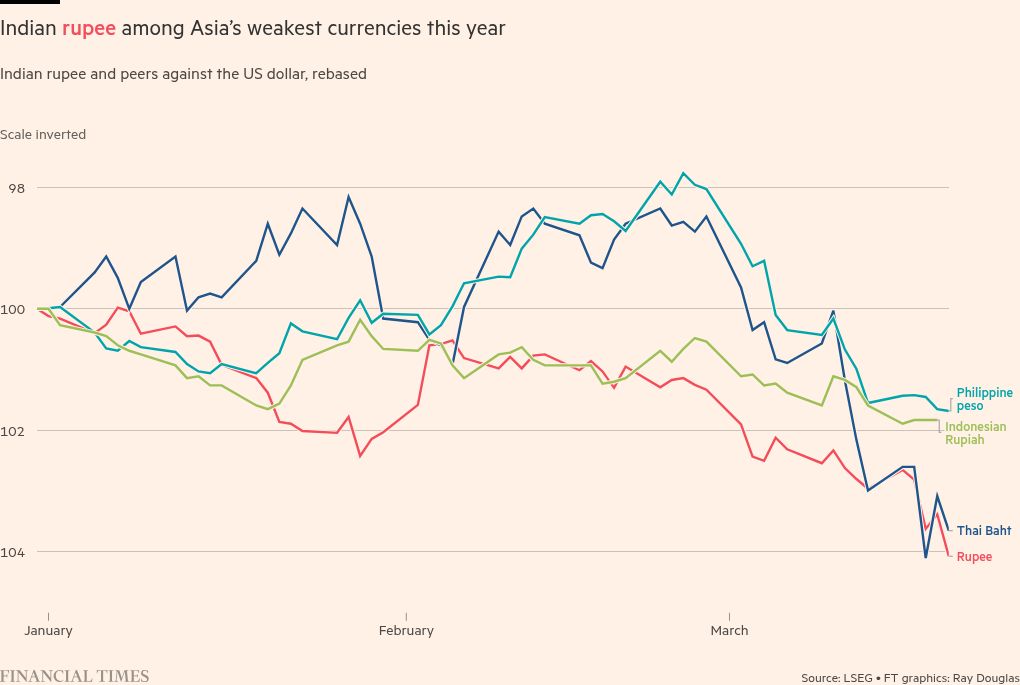 The rupee “is among the more exposed EM [emerging market] currencies to the Iran war, not least because about half of India’s energy imports come from the Gulf states”, said Priyanka Kishore, founder of research consultancy Asia Decoded.