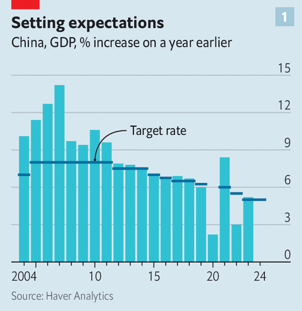 “AMBITIOUS” IS HOW most analysts are describing it. China’s GDP growth target, announced on March 5th, is the same as last year’s, at “around 5%” (see chart 1). But that pace of expansion will be harder to achieve this year. China will not enjoy the one-off benefits of removing strict anti-covid controls, as it did in 2023. And the government, though faced with grim economic news, is reluctant to crank up stimulus, as many businesspeople would like it to. The government’s aims were presented by Li Qiang, the prime minister…