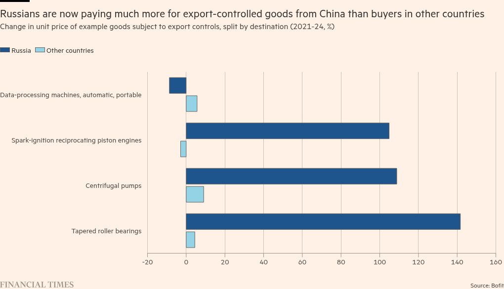 Stay informed with free updates Simply sign up to the Russian business & finance myFT Digest — delivered directly to your inbox. Chinese exporters have been raising prices for Russian military-industrial buyers, exploiting the Kremlin’s reliance on their supplies as western sanctions restrict imports, new research has revealed. Prices of export-controlled products shipped from China to Russia rose 87 per cent between 2021 and 2024 on average, according to a new paper from the Bank of Finland Institute for Emerging Economies (Bofit). The price of similar goods shipped elsewhere rose…