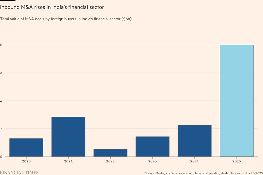 Stay informed with free updates Simply sign up to the Indian business & finance myFT Digest — delivered directly to your inbox. Global banks are buying up stakes in Indian lenders as the country’s government and regulators become increasingly relaxed about foreign entities acquiring significant holdings. Since the start of the year, India’s financial sector has had $8bn worth of deals from foreign companies, up from $2.3bn last year and $1.4bn in 2023, according to Dealogic data. The transactions reflected growing investor confidence in India’s economy and had “opened up…