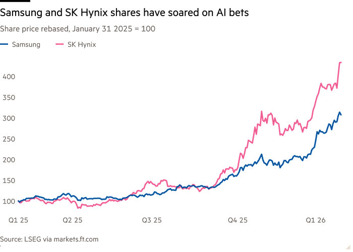 Unlock the Editor’s Digest for free Roula Khalaf, Editor of the FT, selects her favourite stories in this weekly newsletter. The world’s two largest chipmakers have warned that investment in new capacity will not come fast enough to alleviate an AI-driven supply squeeze in semiconductors. Samsung Electronics and SK Hynix said in earnings calls on Thursday that they would increase capital spending “substantially” this year but expected chip shortages to exacerbate in the short term as heightened demand for memory chips in AI data centres tested their capacity. “We are…